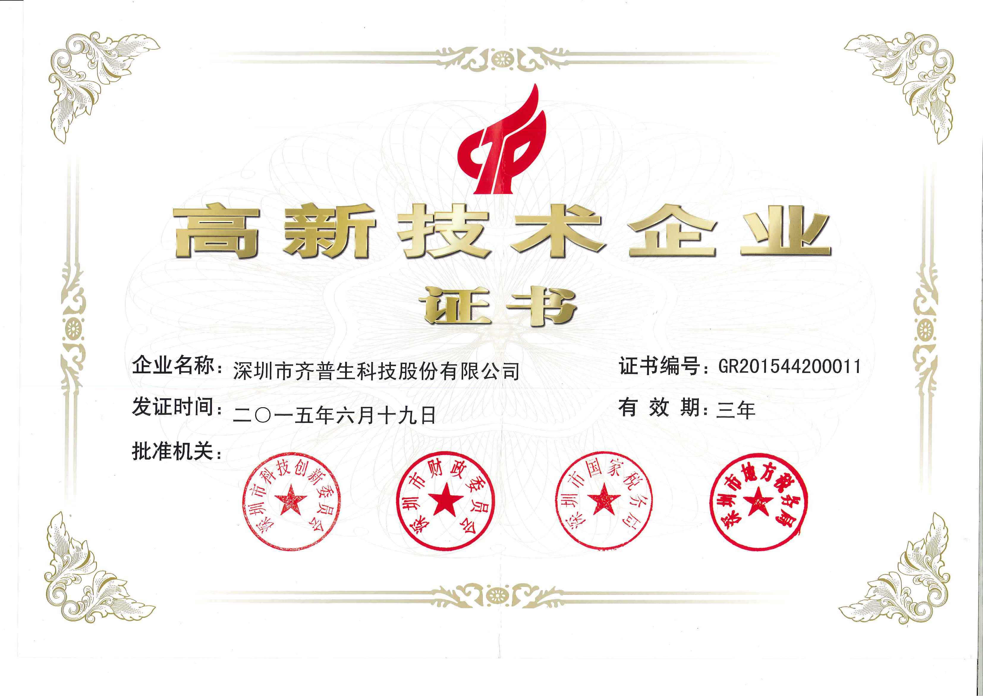 • 國家級高新技術企業證書